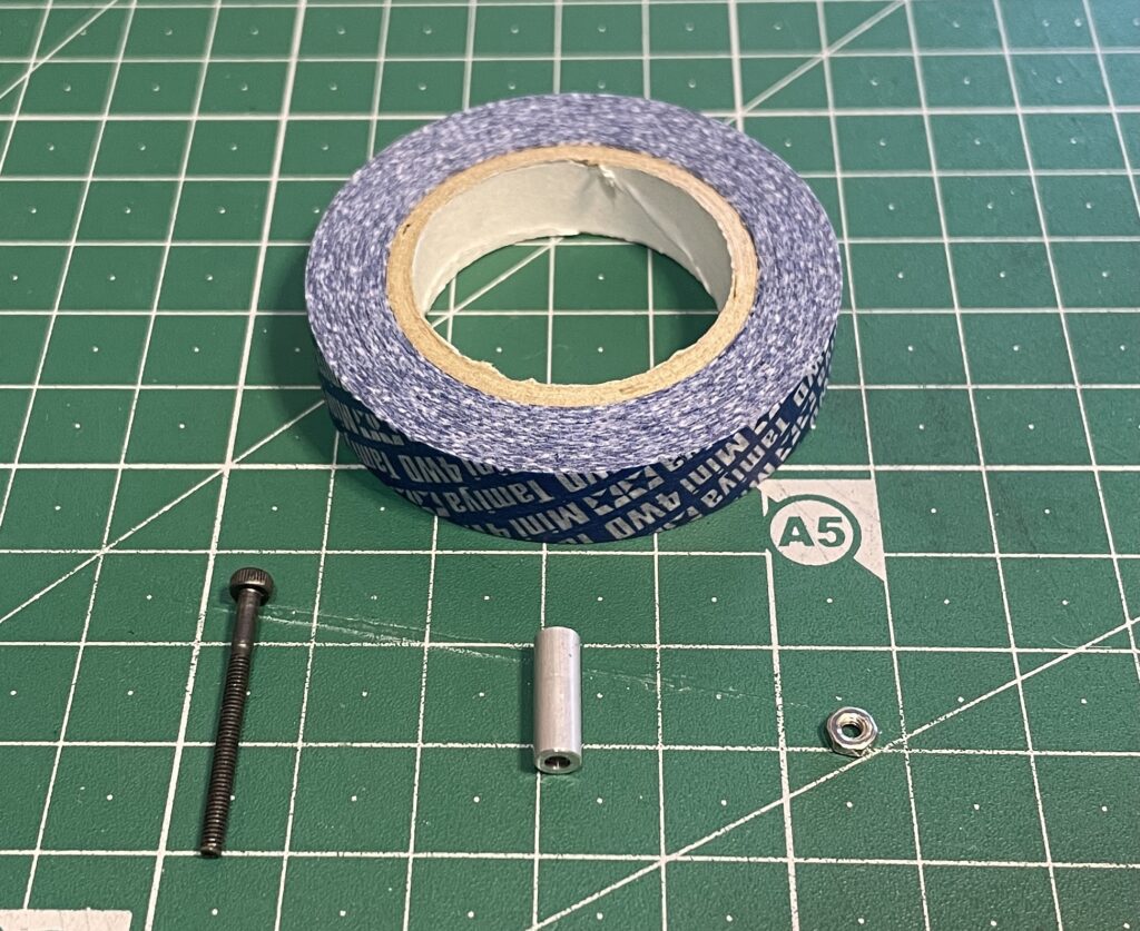 キャップスクリュー(25mm) 、12mmスペーサー、ナット、マルチテープ