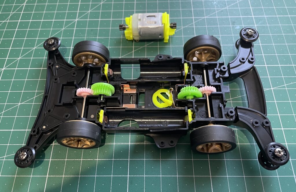 こちらは、MAシャーシのAパーツをMEシャーシに組み込んだ状態になります。黄色いパーツがMAシャーシのAパーツになりますが、ターミナルの爪、スイッチ、モーターケースは共通で使えますね☆