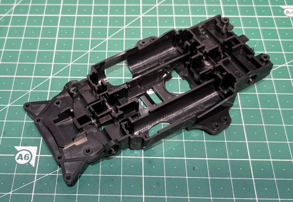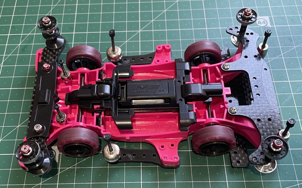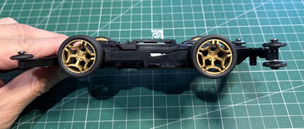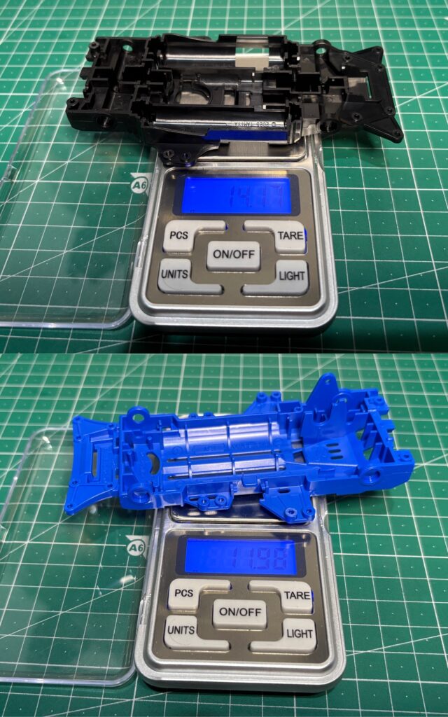 重さとしては14g程度、構造が似ているVZシャーシは12g程度と約2gの差がありますが、そこまで大きな差は無いので、MEシャーシはかなり軽い部類に入るんじゃないかなと思います。