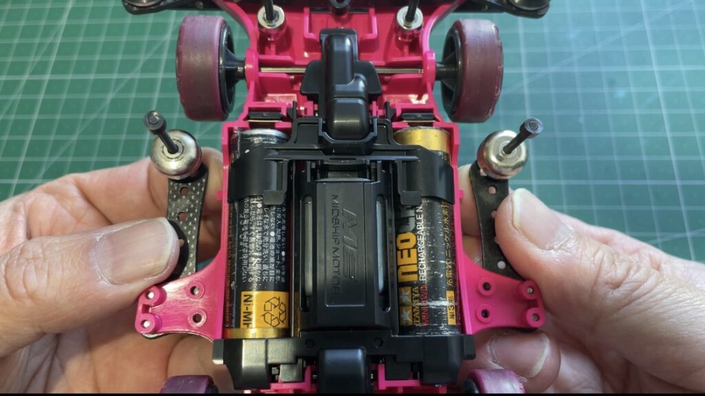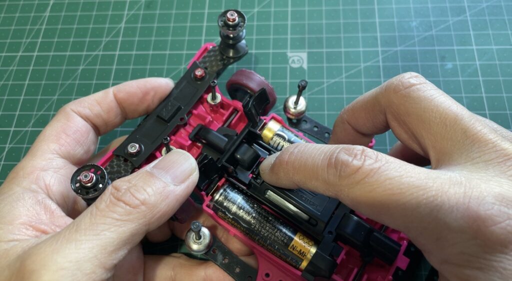 モーターカバーの上にバッテリーホルダを乗せ、爪に引っかけて固定という感じでしたが、今回のMEシャーシでは
