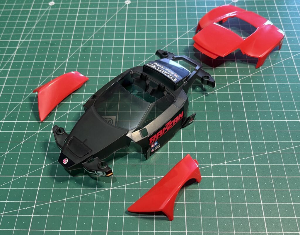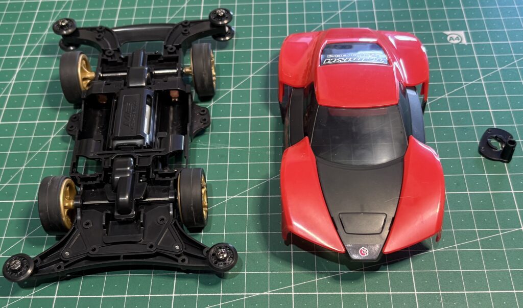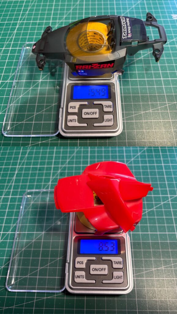 となります。全部取り付けると24g程度とかなり重い部類に入りますが、以前のMAシャーシのボディも