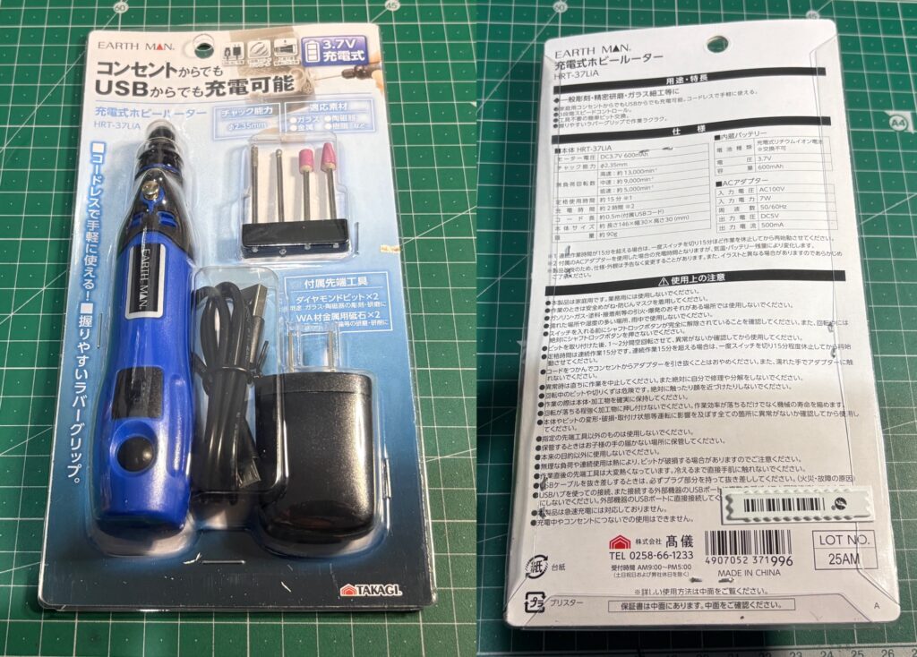 以前から私はこちらのリューターを使っていて、もちろんお値段的にも¥4,000程度でお求め易く、使いやすいんですよね☆ただ、毎回加工する前に電源繋いでから、しかもコードが邪魔になって加工に集中出来ない。。。等の問題があり色々と調べて行く中で、同じ「高儀」さんから出ている「コードレスリューター」を発見して購入してみたという流れになります。