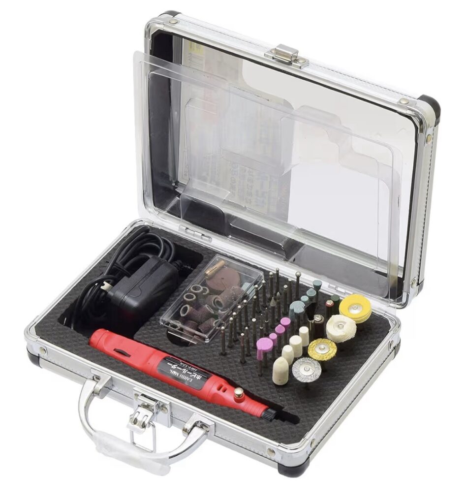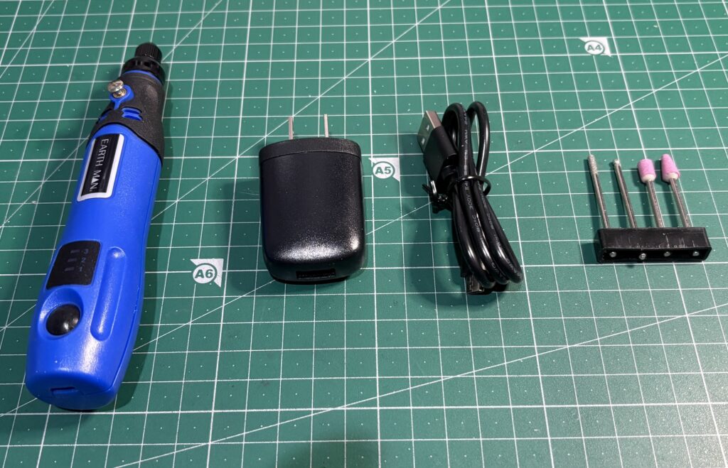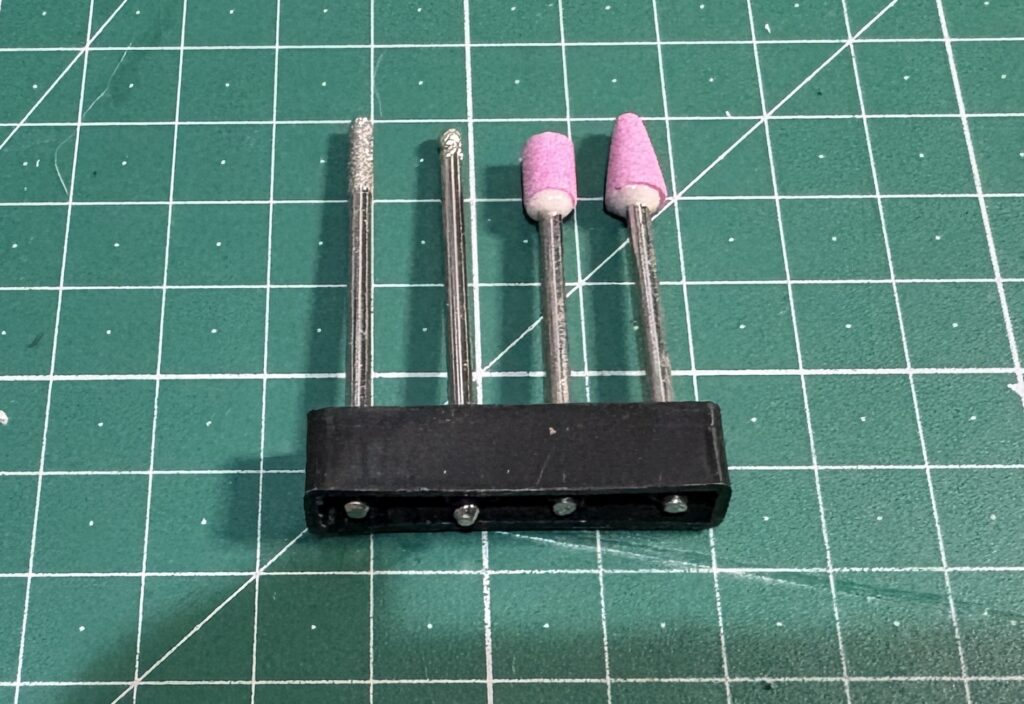 加工ビットが少ししか入ってない(必要な物は無い)ので、あくまでリューター本体を購入したと思ってください。ビットが色々入っているセット(割高)もありますが、ミニ四駆に使うビットは限られてますので、必要なビットはホームセンターで購入して頂ければ良いかと思います。